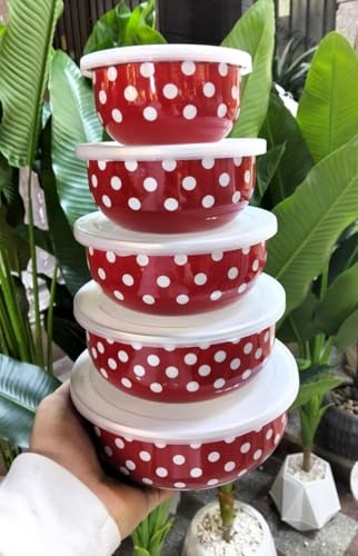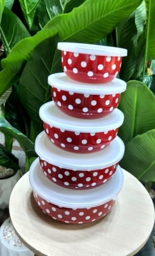 Generic - مجموعة علب ثلاجة معدنية من 5 قطع بمقاسات 10 و12 و14 و16 و18 سم بلون أحمر مع نقاط بيضاء تحافظ على الطعام طازجًا ومقاومة للصدأ وسهلة التنظيف ومناسبة للتخزين اليومي في المطبخ.