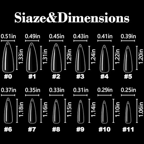 - تأتي بشكل وطول مثاليين، أطراف الأظافر الأكريليك ذات تصميم طويل مدبب بالكامل. تحتوي على 10 مقاسات مختلفة من 0-11، لذلك فهي مريحة لاختيار المقاس الأنسب الذي يناسب كل إصبع، أيًا كان لديك سرير أظافر كبير أو إصبع ضيق