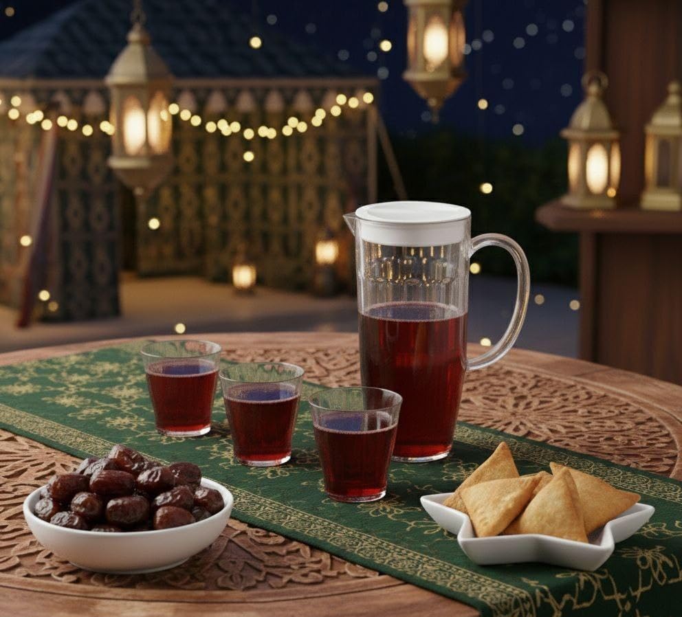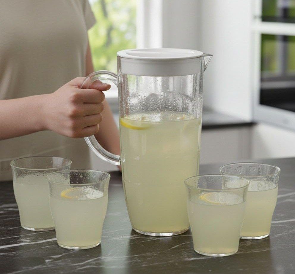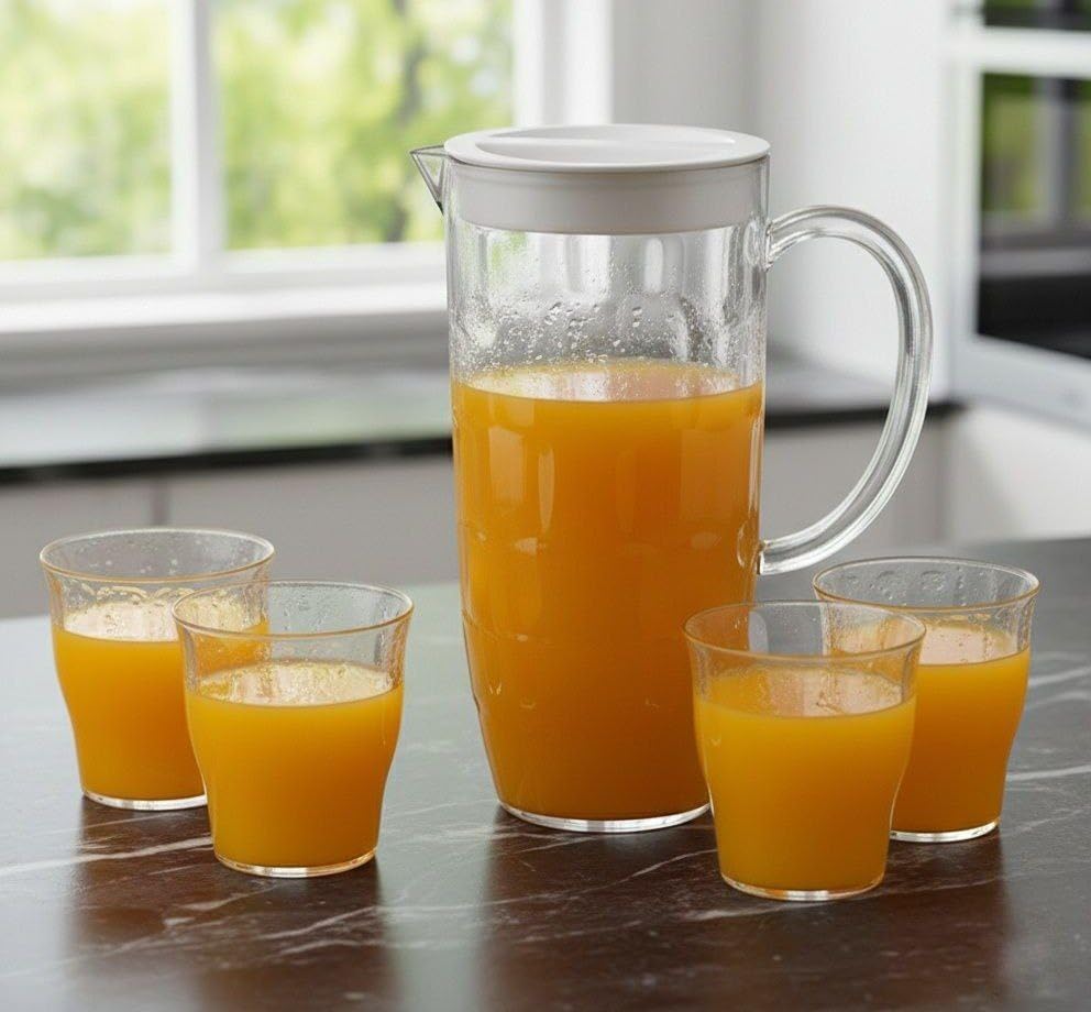 - مجموعة كاملة: تتضمن مجموعة أباريق الأكريليك 5 في 1 إبريق كبير بغطاء أبيض و4 أكواب مطابقة، مثالية لتقديم المياه والعصائر والمشروبات الأخرى للعائلة والضيوف