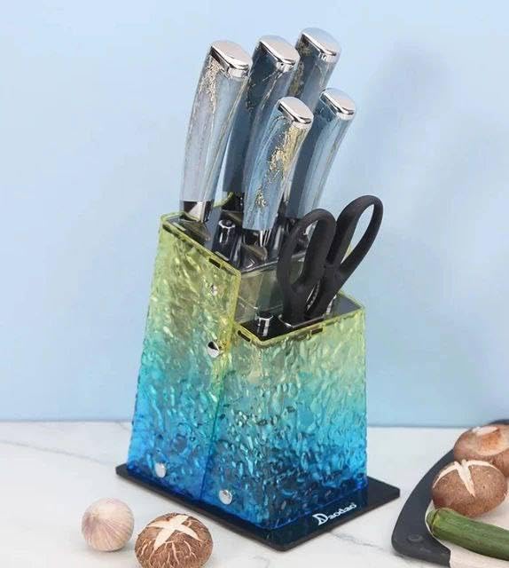 - حامل أنيق: تأتي السكاكين مع حامل أنيق من الأكريليك والفولاذ المقاوم للصدأ، مما يجعلها هدية مثالية للعرائس وربات البيوت.