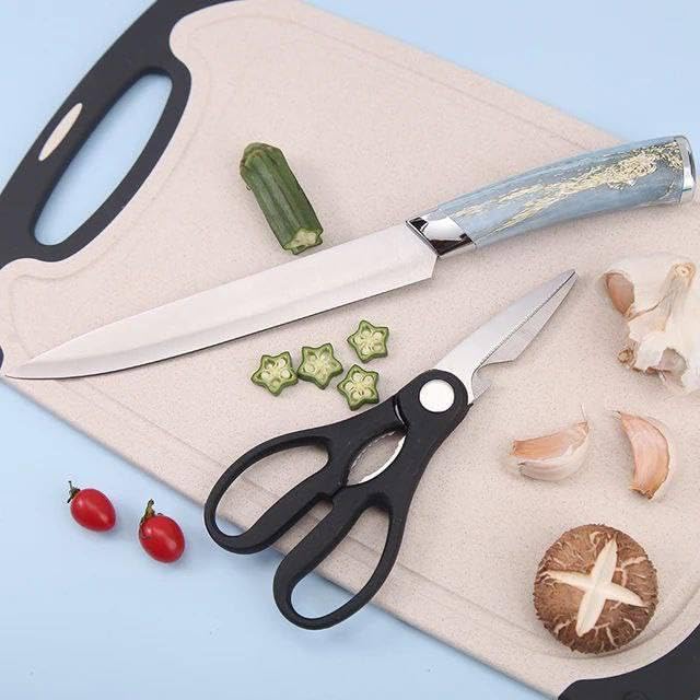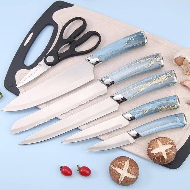 - طقم متعدد الاستخدامات: يوفر طقم السكاكين المكون من 6 قطع مجموعة شاملة من الشفرات تناسب جميع احتياجات التقطيع الخاصة بك، بما في ذلك سكين اللحم/الدجاج (32 سم)، سكين السمك (32 سم)، سكين الخبز (21 سم)، سكين الخضروات (21 سم)، سكين الفاكهة (21 سم)، بالإضافة إلى مقص.