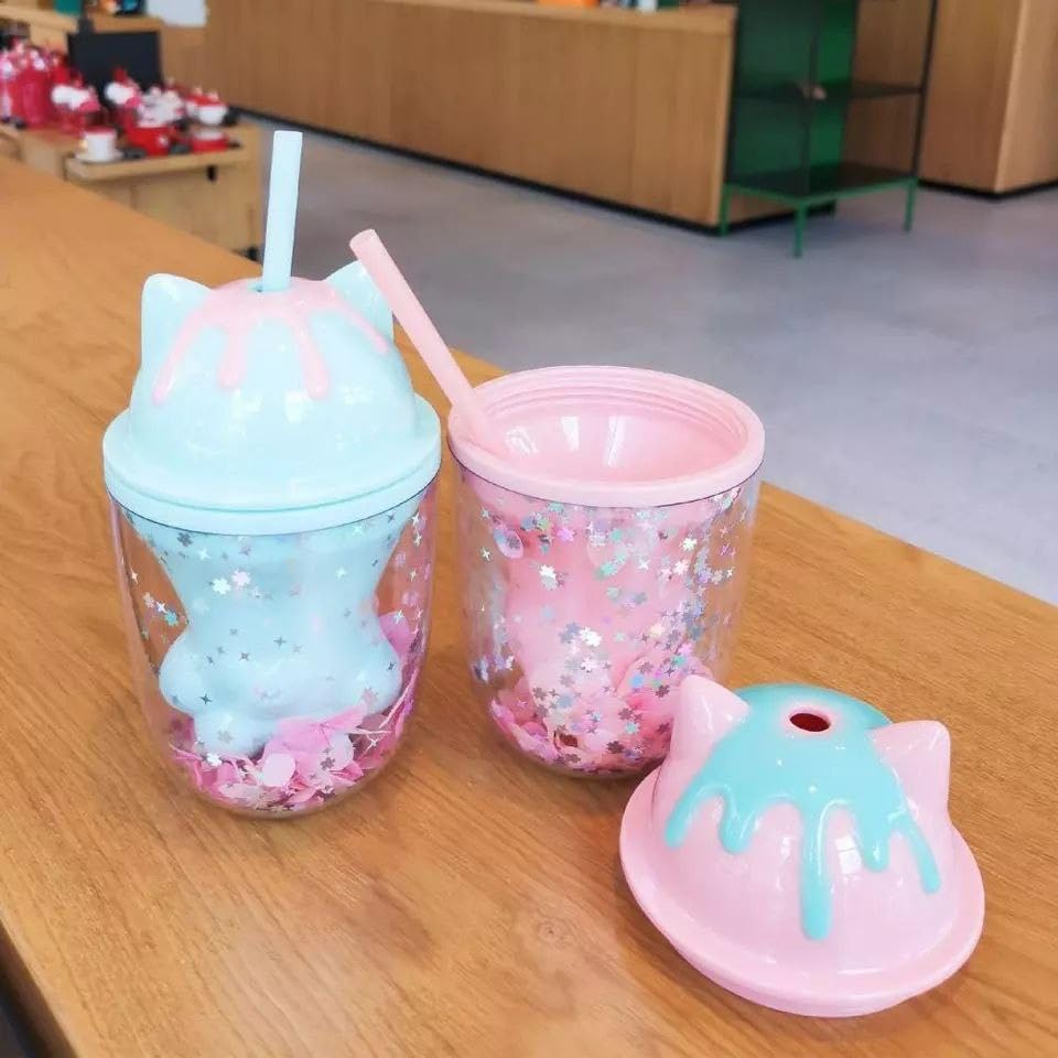 Generic - جيني كوب اكريليك مع قشة وغطاء على شكل قطة، تصميم قصاصات ورقية لامعة، بينك وازرق