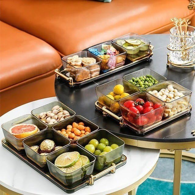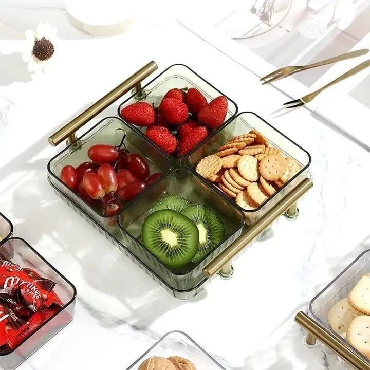 - مساحات تخزين متعددة الاستخدامات: أربعة أقسام منفصلة تسمح لك بتنظيم وتقديم أنواع مختلفة من الوجبات الخفيفة أو الفواكه أو المكسرات أو الحلوى في وقت واحد، مما يحافظ على النكهات مميزة وأنيقة