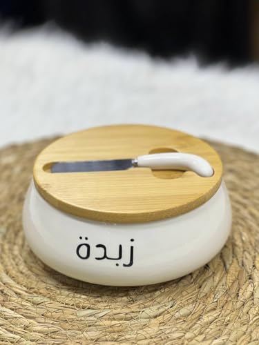 - السعة: طبق زبدة بسعة 500 ملليلتر بتصميم مكتوب باللغة العربية الأنيقة، مناسب لتخزين وتقديم الزبدة أو السمن