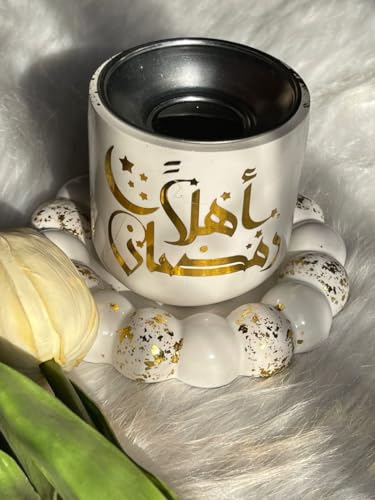 - مزايا التصميم: مبخرة خرسانية بلون أبيض بتصميم فن الخط العربي أنيق وزخارف شكل قمر ونجوم بلون ذهبي، مثالية لاحتفالات رمضان.