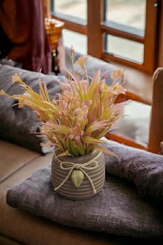 - مزايا التصميم: تنسيق زهور الزنبق الصناعية المصنوعة بشكل جميل مع أزهار بلون وردي وأصفر في أصيص سيراميك بلون رمادي عصري مع تصميم مضلع وفيونكة للديكور