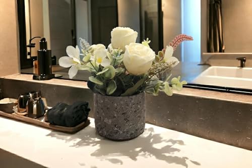 Generic - باقة زهور صناعية مرتبة في أصيص خرساني مزخرف، ورود وردي اللون مع أوراق شجر خضراء، ديكور للمنزل والمكتب، زهور بيضاء