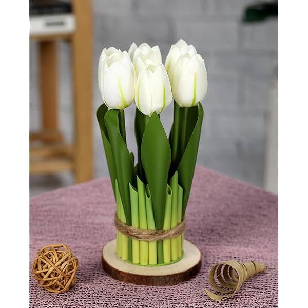 - تصميم واقعي: سيقان زهور التوليب البيضاء المصنوعة بخبرة مع بتلات وأوراق نابضة بالحياة، مما يخلق ترتيبًا صناعيًا مذهلاً يبدو جديدًا على مدار العام