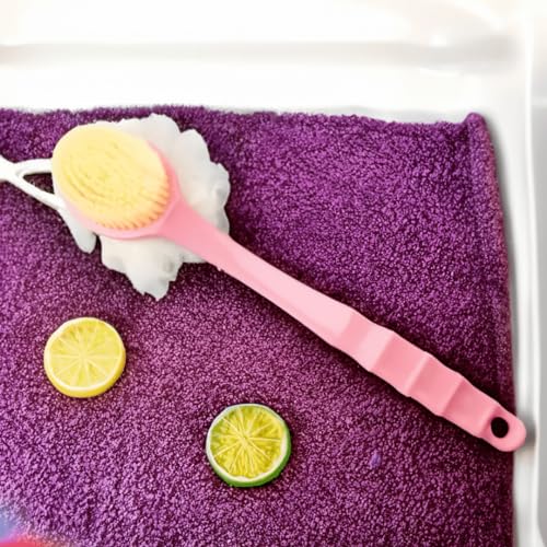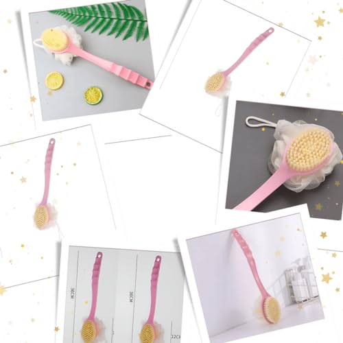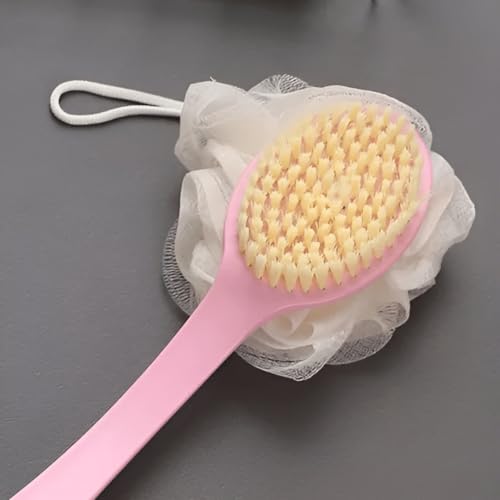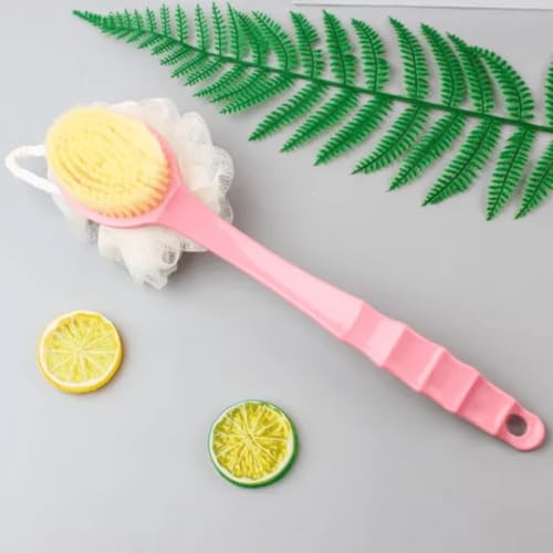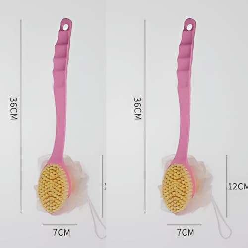 Spaceshoop - فرش للجسم بمقبض طويل واسفنجة حمام للبشرة، فرشاة تنظيف مزدوجة الجوانب لليفة وتنظيف الظهر للاستحمام، شعيرات تدليك مناسبة للمنتجعات الصحية الرطبة او الجافة للرجال والنساء [وردي]
