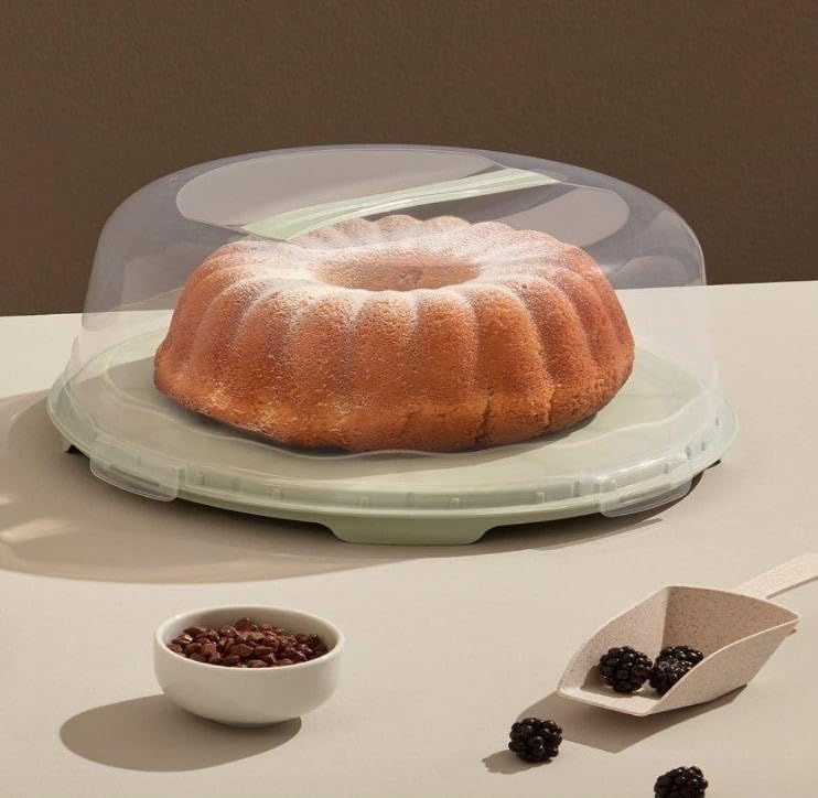 - مقاس كبير: يبلغ مقاسه 32 × 32 سم بارتفاع 10-12.5 سم، مما يوفر مساحة واسعة لتخزين وعرض كعك البوندت وكعك الطبقات والحلويات المختلفة