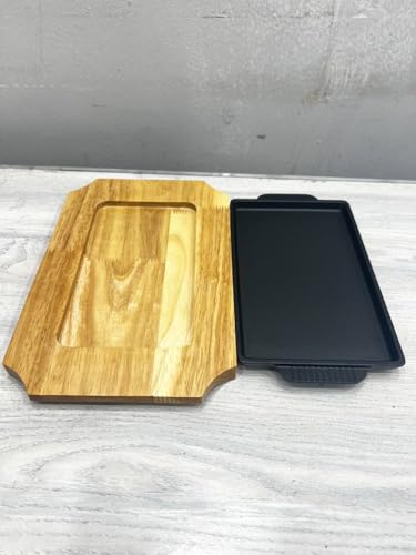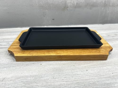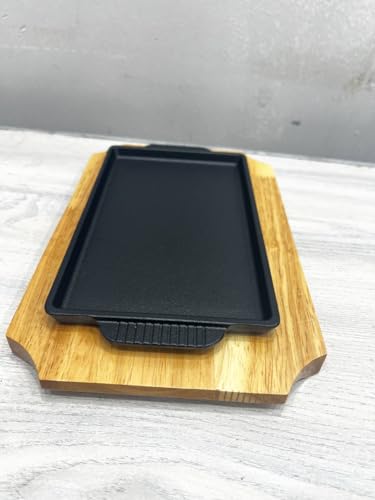 Generic - طبق سيزلر من حديد مصبوب بقاعدة خشبية، صينية شواء مستطيلة لشرائح اللحم والمأكولات البحرية، صينية تقديم بأسلوب المطاعم