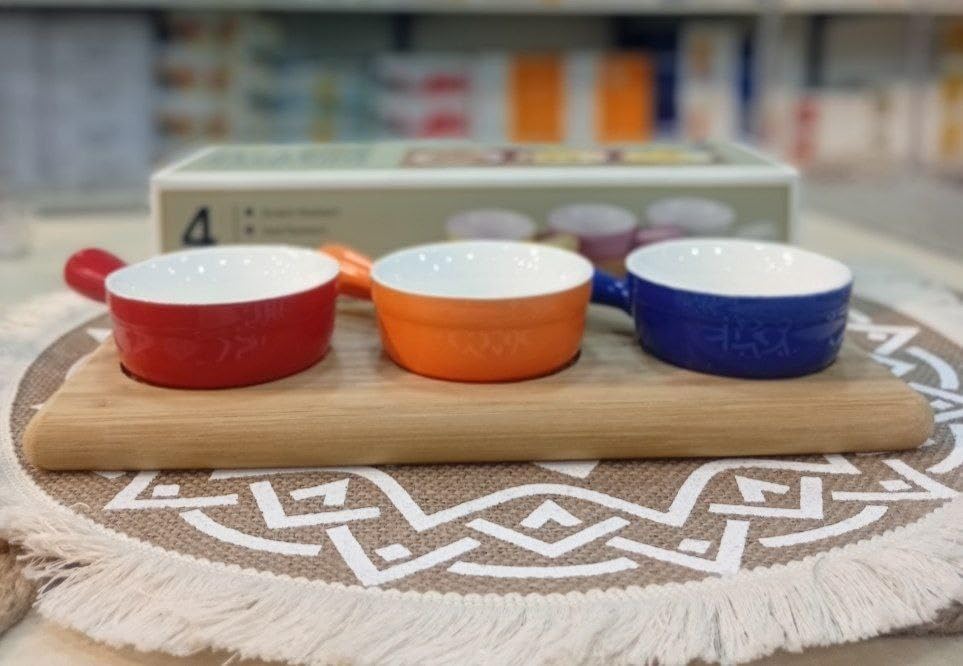 • تصميم عملي: يتميز كل وعاء بمقبض مريح لسهولة الحمل والتقديم، مع جزء داخلي أبيض لتقديم الطعام بشكل أنيق.