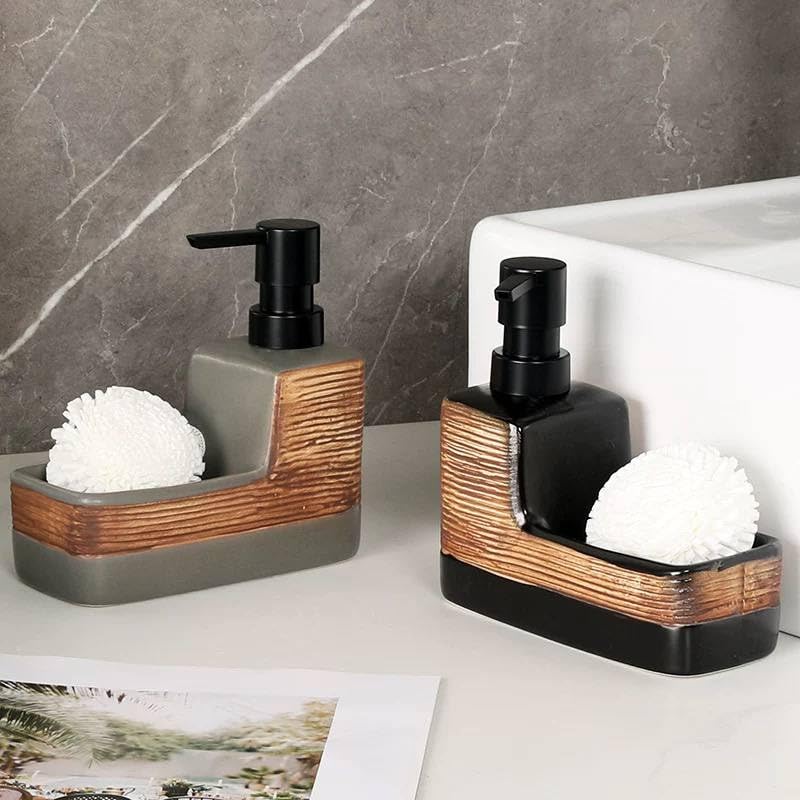 Generic - موزع صابون سيراميك مع حامل إسفنجة بتصميم أسود وخشبي للمطبخ والحمام