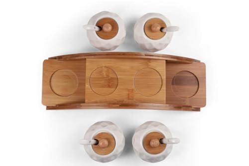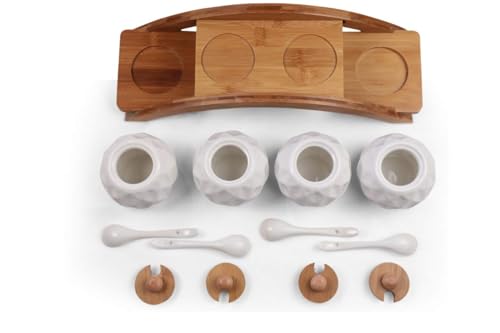 Generic - طقم برطمانات تخزين توابل من السيراميك والخشب، مصنوع من السيراميك مع حامل خشبي، مجموعة من 4 قطع، حجم مدمج