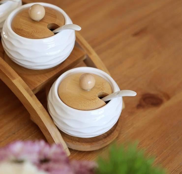 - تصميم أنيق: برطمانات توابل من البورسلين الأبيض مع جزء خارجي مموج وأغطية خشبية طبيعية، مثالية لجماليات المطبخ العصرية