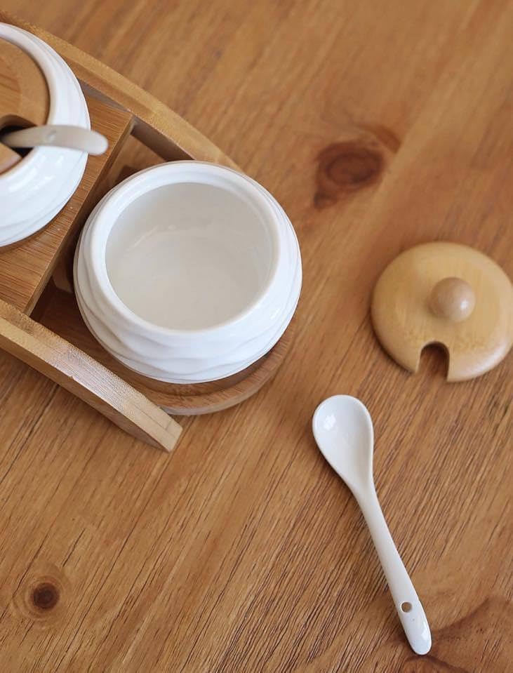 - مجموعة كاملة: تتضمن برطمانان من السيراميك، وملعقتين من البورسلين المطابق، وصينية تقديم خشبية أنيقة للعرض المنظم