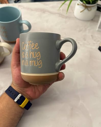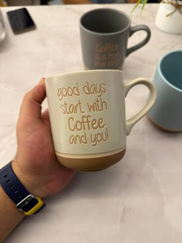 - التصميم: كوب سيراميك أنيق يتميز بلون أزرق فاتح مع تصميم نص ذهبي وقاعدة بنية، مثالي للاستخدام اليومي.