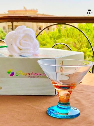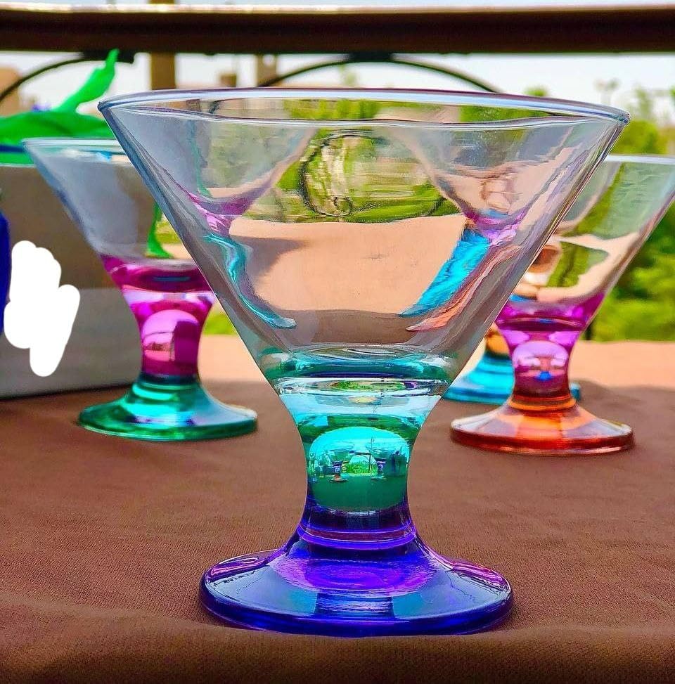 - تصميم أنيق: طقم مكون من 6 أكواب زجاجية للحلويات بألوان مميزة وتصميم أنيق على شكل كأس المارتيني، مثالي لتقديم الآيس كريم والحلويات والمشروبات الباردة.