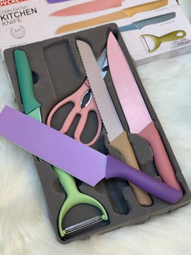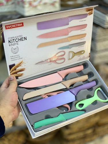 Generic - طقم سكاكين مطبخ مشرشرة مكونة من 3 سكاكين وساطور ومقشرة ومقص (حادة)