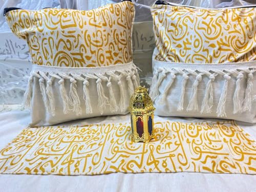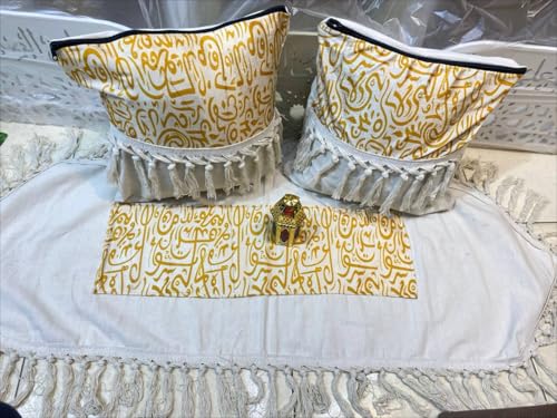 - مجموعة كاملة من 3 قطع: تتضمن مجموعة الطعام الأنيقة هذه سلتي تخزين مزخرفتين ومفرش طاولة مطابق، وكلها تتميز بخط عربي ذهبي جميل على خلفية بيضاء