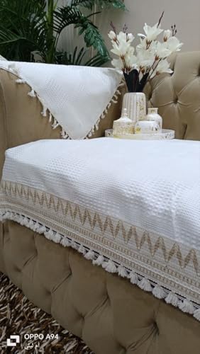 Generic - طقم أغطية اريكة قطنية بحواف مكرمية، 10 قطع تتضمن أغطية 1.95 م × 85 سم و1.45 م × 85 سم وأغطية كراسي ومناديل، فلو (أبيض)