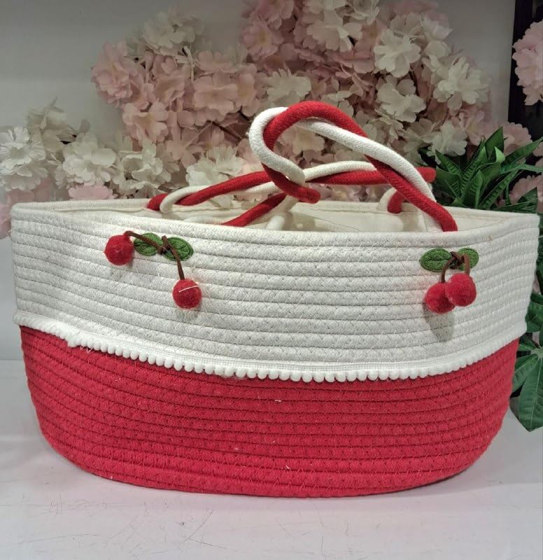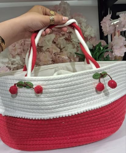 - هيكل مصنوع يدويًا: مصنوع من حبل قطني عالي الجودة بتصميم جميل بلونين باللونين الأحمر والأبيض، مزين بزخارف الكرز الساحرة لمزيد من الجاذبية الجمالية