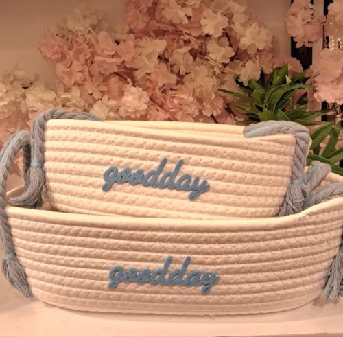 Generic - جيني سلال تخزين قطنية بمقابض بتصميم مطرز بعبارة Good Day، مجموعة من قطعتين (بيج وازرق) .بي