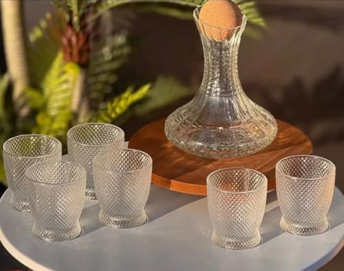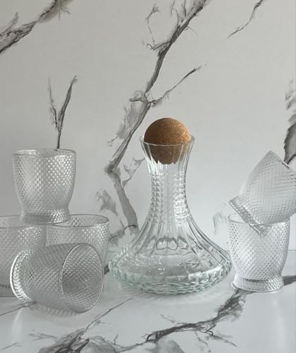 - تصميم أنيق: وعاء وأكواب من الزجاج الكريستالي يتميز بنقش معقد بنمط ماسي لتقديم عرض راقي في أي تجمع.