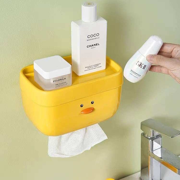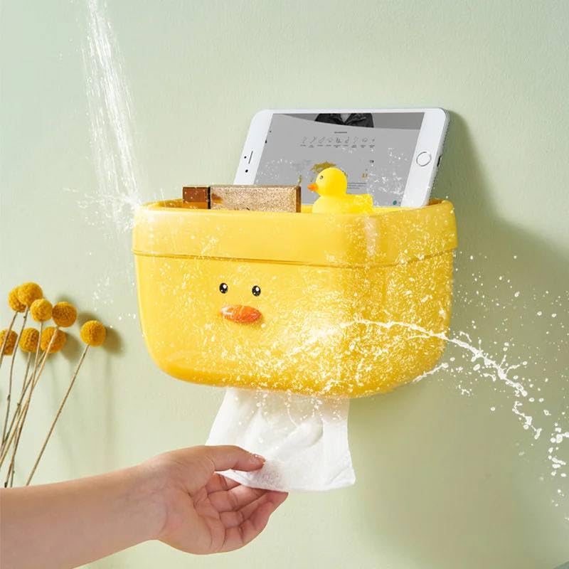 Generic - جيني حامل علبة مناديل الحمام بتصميم بطة لطيفة مع رف للموبايل، حامل يثبت على الحائط مقاوم للماء، لون اصفر
