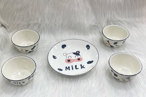 Generic - طقم أوعية حليب ولبانة بورسلين بنمط لطيف بلمسة بيضاء مع بقع سوداء، طقم لبانة بورسلين من 5 قطع مع 4 أطباق وطبق مسطح، مقاس A2 - لون أبيض