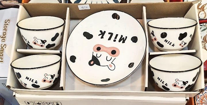 - موضوع التصميم: طقم سفرة بورسلين رائع بتصميم بقرة، يتميز بنقاط سوداء وبيضاء مع وجوه بقرة لطيفة وكلمة "حليب" مطبوعة على كل قطعة.