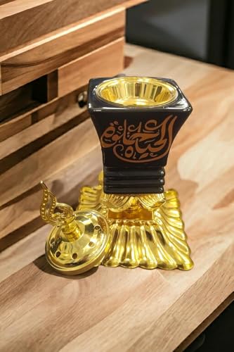 Generic - مبخرة مزخرفة بفن الخط العربي، مصنوعة من البورسلين والمعدن بلون ذهبي بتصميم تقليدي (لون أسود)