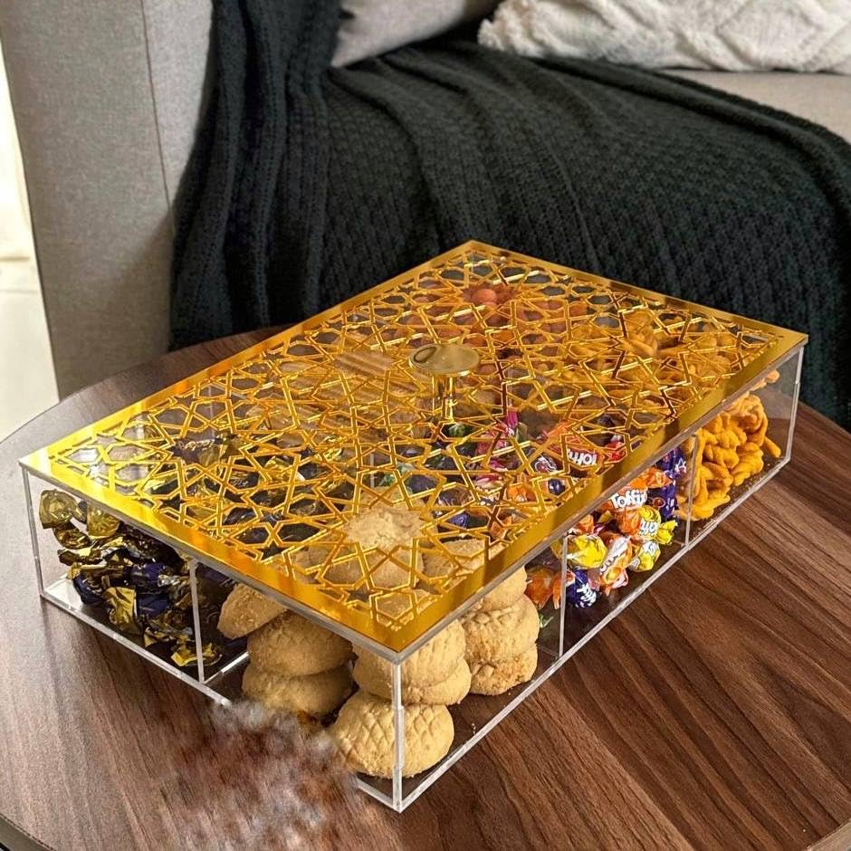 - الأقسام: تتميز بـ 6 أقسام منفصلة لتنظيم أنيق للحلويات المختلفة والكاك والبسكويت وغيرها من الأطباق الشهية