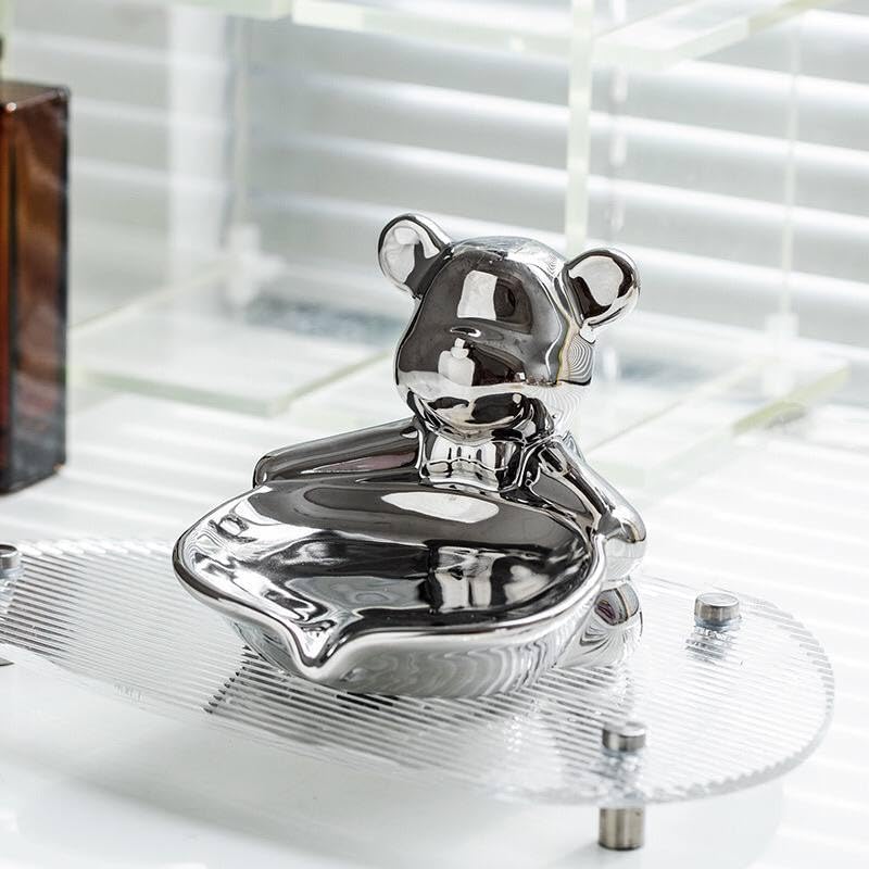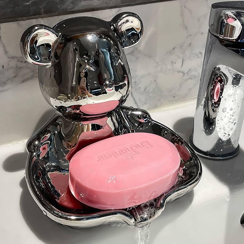 - التصميم: طبق وموزع صابون سيراميك أنيق على شكل دب يتميز بلمسة نهائية أنيقة من الكروم الفضي ولمسات وردية ساحرة