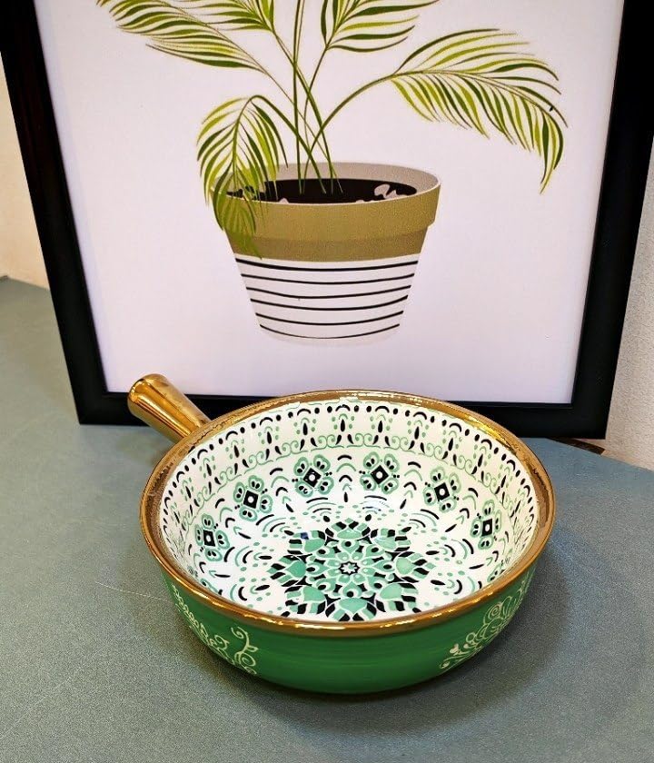 - تصميم أنيق: طاسة قلي سيراميك رائعة تتميز بنقش دائري (ماندالا) دقيق باللونين الأخضر والأبيض، مع مقبض فاخر مطلي بالذهب لإضافة لمسة ديكورية مذهلة.