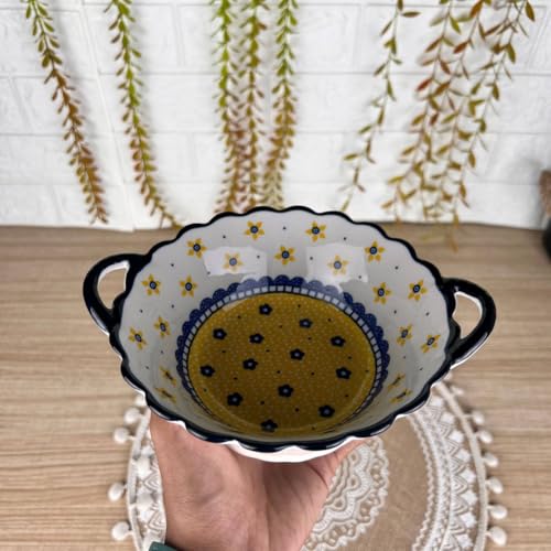 • تصميم مصنوع يدويًا: بولة تقديم مصنوعة من السيراميك جميلة مزخرفة بنقوش زهرية باللونين الأصفر والأزرق الكحلي مع حواف متموجة أنيقة لإطلالة راقية.