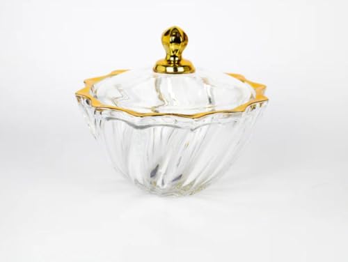 - تصميم أنيق: يتميز طبق الحلوى المصنوع من الزجاج الكريستالي بنمط دوامة متطور مع حواف ذهبية فاخرة وغطاء مزخرف يعلوه لمسة نهائية ذهبية