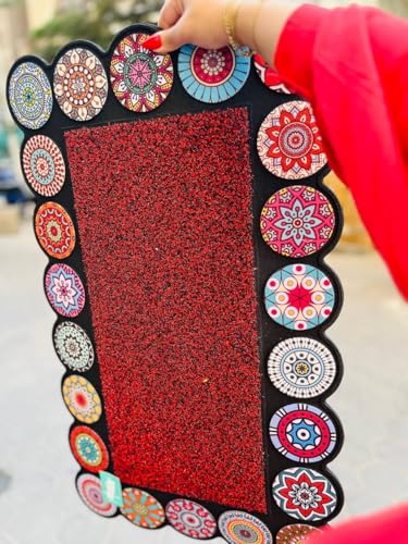 - تصميم الألوان: مزيج مذهل من الألوان الأساسية الحمراء والسوداء مزينة بأنماط ميدالية فيروزية ووردية ومتعددة الألوان