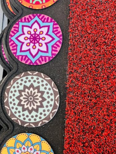 - عناصر التصميم: أنماط دائرية فريدة مستوحاة من ماندالا بألوان نابضة بالحياة تؤطر السجادة بشكل زخرفي، مما يخلق حدودًا فنية على خلفية سوداء