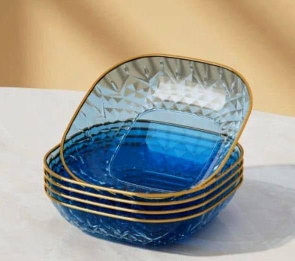 - تصميم أنيق: أوعية حلوى زجاجية زرقاء جميلة تتميز بنمط مقطوع بالألماس وزخرفة ذهبية فاخرة حول الحافة، مثالية لتناول الطعام والترفيه الراقي