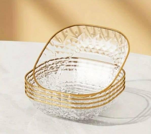 - تصميم أنيق: مجموعة من 6 أطباق حلوى زجاجية شفافة تتميز بنمط ماسي معقد وحواف ذهبية فاخرة لتناول الطعام والترفيه الراقي