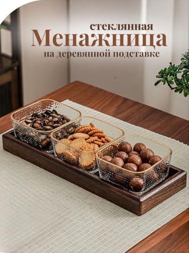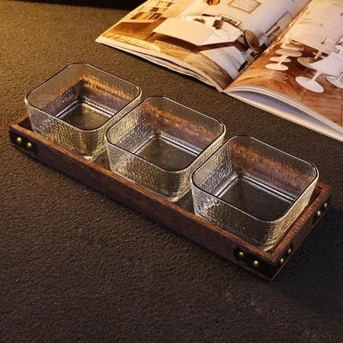 Generic - طقم تقديم زجاجي مزخرف، 3 أطباق عميقة ذات ملمس مزخرف مع صينية خشبية