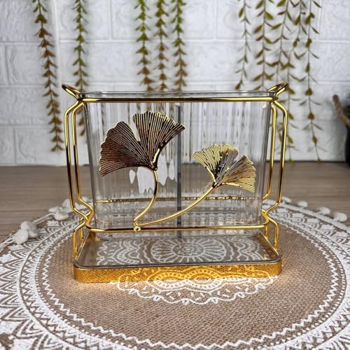 • تصميم أنيق: يتميز مسند المعالق الزجاجي الشفاف بإطار معدني ذهبي متطور مع نمط أوراق الجنكة المزخرفة، مما يضيف لمسة فاخرة إلى ديكور مطبخك.
