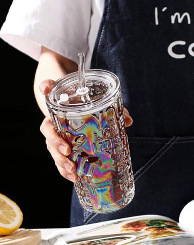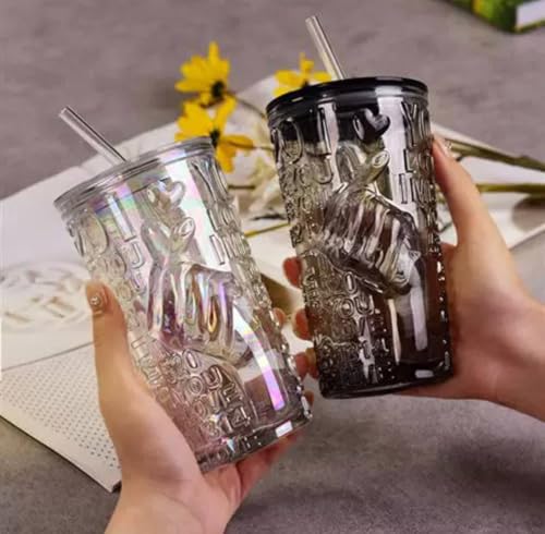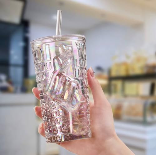 Generic - جيني طقم اكواب زجاجية مزخرفة مع ماصة، 350 مل، نمط منقوش، غطاء محكم الغلق، قطعة واحدة