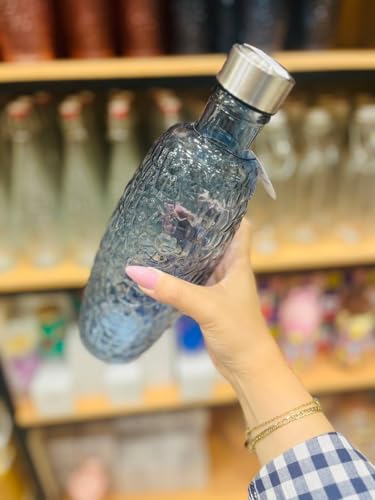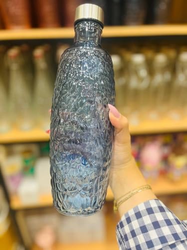 Generic - جيني زجاجة مياه زجاجية مزخرفة بنمط منقوش، غطاء ستيل، روم (رمادي سومك)