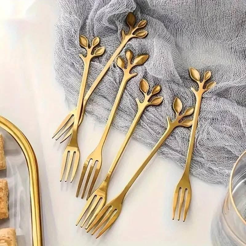 Generic - شوك تزيينية لتناول الحلويات مصنوعة من الفولاذ المقاوم للصدأ المطلي بالذهب بتصميم أوراق شجر، مجموعة من 6 قطع