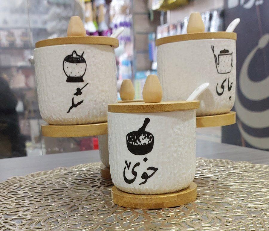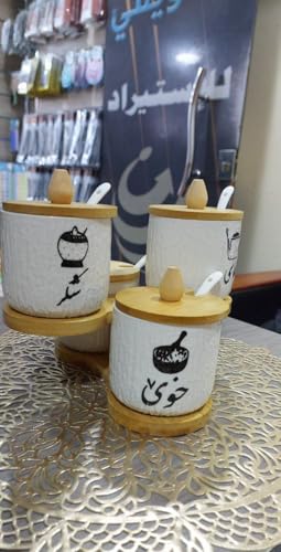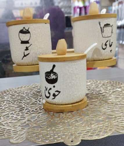 - تصميم أنيق: علب تخزين من البورسلين الأبيض تتميز بالخط العربي وأيقونات زخرفية، مثالية لإضافة لمسة ثقافية إلى ديكور مطبخك.