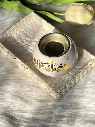 Generic - مبخرة رمضان ديكورية بكتابة عربية، أبيض وذهبي، مجموعة من قطعتين مع صينية