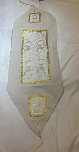 - عناصر التصميم: مفرش طاولة رمضان جميل يتميز بأنماط أنيقة مزينة بالذهب مع هلال ونجوم وكتب وزخارف مميزة.