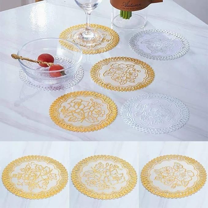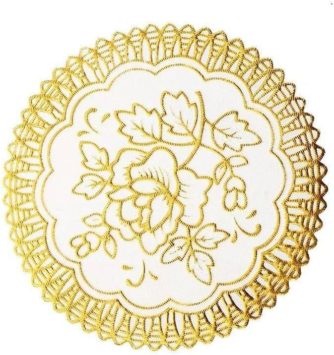 - تصميم أنيق: قواعد أكواب دائرية مصنوعة بشكل جميل تتميز بتطريز زهور ذهبية اللون على خلفية بيضاء نقية.